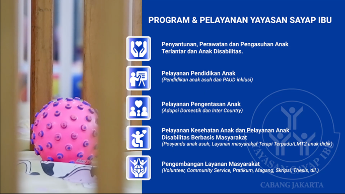 Yayasan Sayap Ibu Cabang Jakarta merupakan lembaga independen yang telah berdiri sejak 30 September 1955 dan tumbuh dari prakarsa tokoh sosial, di antaranya Ny. Sulistina Sutomo dan Ny. J.S. Nasution. Berlokasi di Jalan Barito II No. 55, Kebayoran Baru, Jakarta Selatan, yayasan ini menjadi rumah dan ruang perlindungan bagi anak-anak dalam kondisi rentan, khususnya balita dan anak usia dini. Sebagian besar dari mereka adalah golongan disabilitas dan membutuhkan perhatian khusus dalam pengasuhan, terapi, serta layanan sosial. Yayasan Sayap Ibu berkomitmen memastikan anak-anak tersebut tumbuh dalam lingkungan yang aman, penuh kasih sayang, dan memiliki akses terhadap pendidikan, kesehatan, serta kesempatan hidup yang lebih baik.